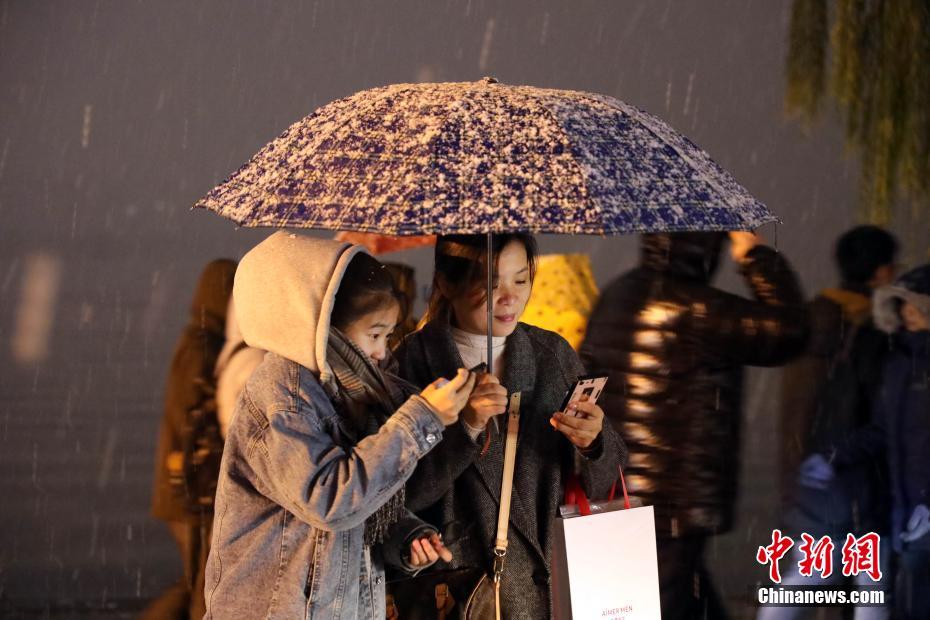 12月8日,杭州普遍降雪,众多游客前往断桥上拍摄雪景。当晚,杭州市气象台发布暴雪蓝色预警信号。中新社记者 毛建军 摄