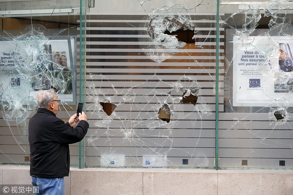 当地时间2018年12月9日,法国巴黎,“黄背心”抗议活动持续进行,商店被砸、汽车被烧毁,街头一片狼藉