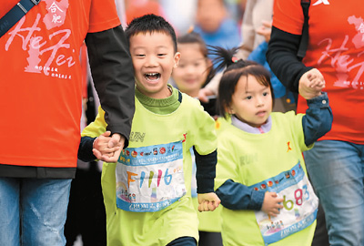 小朋友和家长参加2018合肥国际马拉松赛亲子跑的比赛。(新华社记者 张 端摄 )