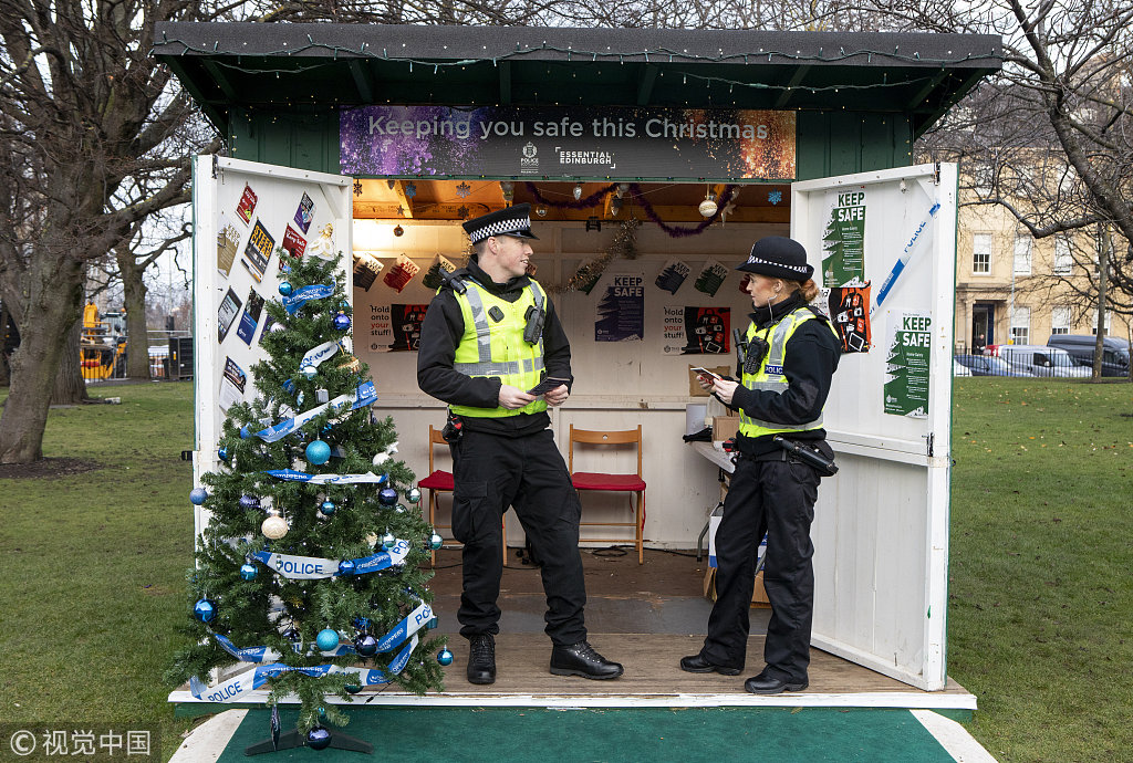 当地时间2018年12月12日,英国苏格兰爱丁堡,警察在圣诞集市巡逻。