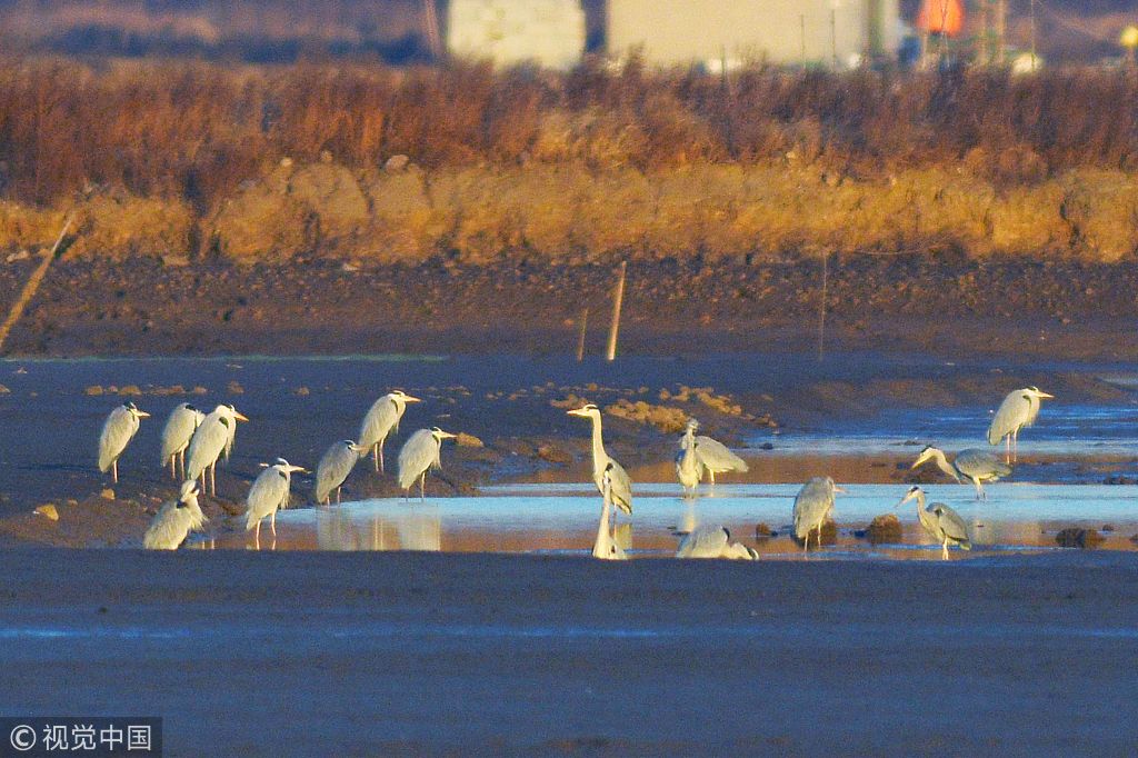 2018年12月12日,围在青岛胶州湾湿地养虾池旁进食的苍鹭。