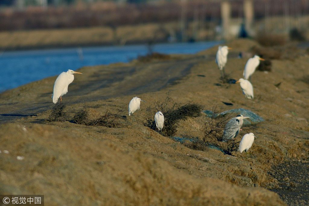 2018年12月12日,在青岛胶州湾湿地,大白鹭、小白鹭、苍鹭混群栖息。