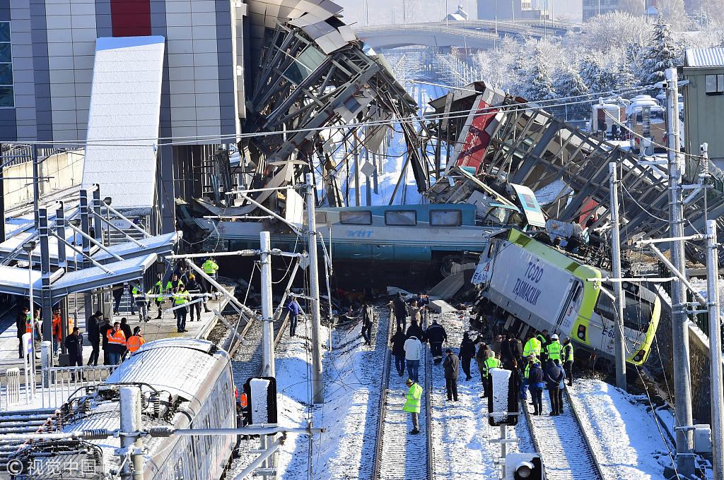 当地时间2018年12月13日,土耳其安卡拉,一辆高速列车与一辆调度机车相撞,死亡人数已上升至9人,另有47人受伤。当时这列高速列车正开往中部省份科尼亚。