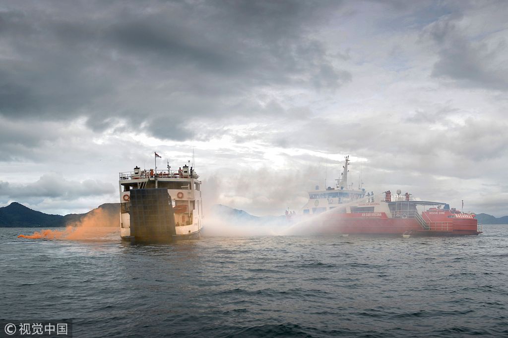 当地时间2018年12月13日,印度尼西亚在班达亚齐附近海域,搜救队开展救援演习,演习内容是解救在海上或者在燃烧的船只上的受害者。
