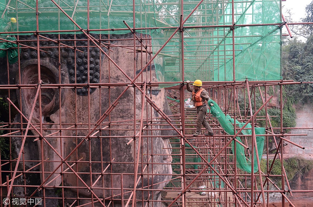 四川乐山大佛本体已全遮蔽 正“体检”胸腹 远看像机器人