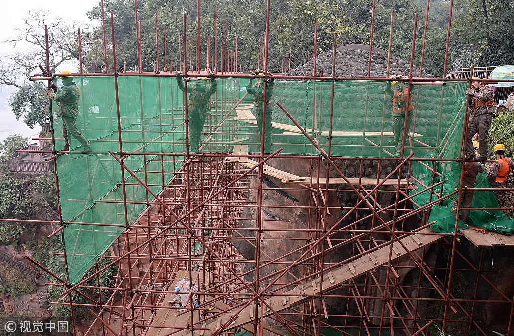 四川乐山大佛本体已全遮蔽 正“体检”胸腹 远看像机器人