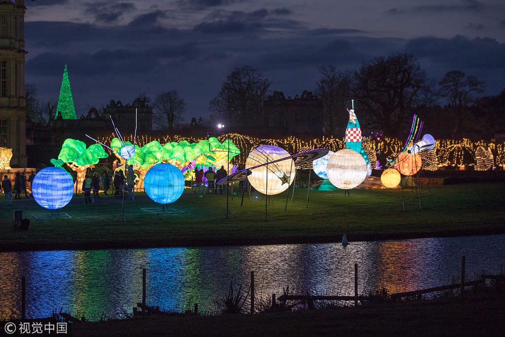 当地时间2018年12月12日,英国威尔特郡,当地一座伊丽莎白时代的庄园举行了一年一度的灯光秀,本次灯光秀展出了来自中国四川自贡的工匠们巧手用丝绸制作的数千盏灯笼。灯光秀亮点包括一座20米高的金字塔、史前恐龙和手持武器的中世纪骑士灯笼。这次灯光秀将对公众开放至1月6日。