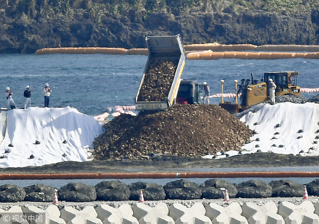 当地时间2018年12月14日,日本冲绳边野古名护市,美军普天间机场将搬迁至名护市边野古,填沙工程启动。 10月31日上午日本政府重新启动了驻日美军普天间机场搬迁到地名护市边野古沿岸的主体填海造陆的相关工程,并计划在年内填上沙土,全面开展建设作业。