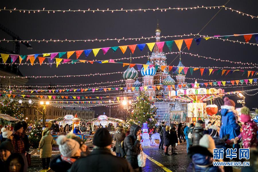 12月14日,在俄罗斯首都莫斯科,人们在红场漫步。 元旦临近,莫斯科市中心布置了各色装饰迎接新年。新华社记者 白雪骐 摄