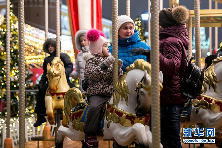 12月14日,在俄罗斯首都莫斯科市中心,人们乘坐旋转木马。 元旦临近,莫斯科市中心布置了各色装饰迎接新年。 新华社记者 白雪骐 摄