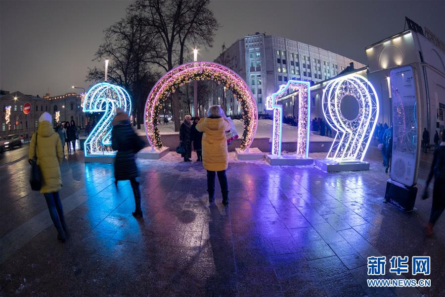 12月14日,在俄罗斯首都莫斯科市中心,人们在2019灯饰前留影。 元旦临近,莫斯科市中心布置了各色装饰迎接新年。 新华社记者 白雪骐 摄