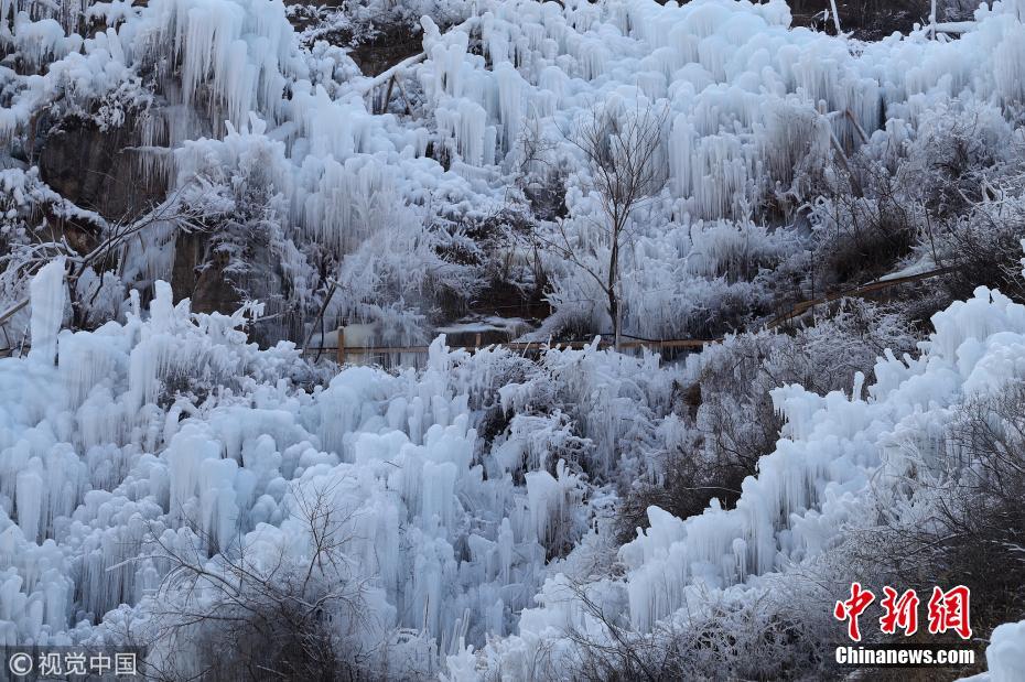 12月14日,北京门头沟区妙峰山镇多处冰瀑景观进入最佳观赏期,炭厂村神泉峡景区大面积人工冰瀑形成美丽的冰瀑景观,预计12月19日正式向游客开放。侯继庆 摄 图片来源:视觉中国