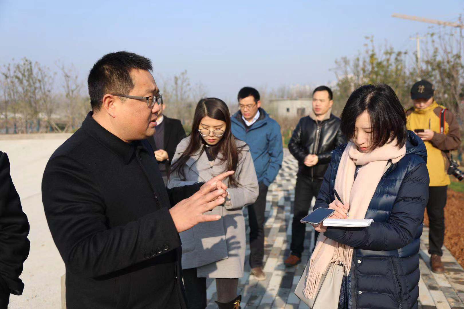 滁州高教科创城文体中心的设计理念为“云飞燕舞”,整体布局充分考虑景观、流线、建筑造型的相互统一。图为滁州高教科创城经济发展部部长张峰为采访团成员进行介绍。(谢明 摄)