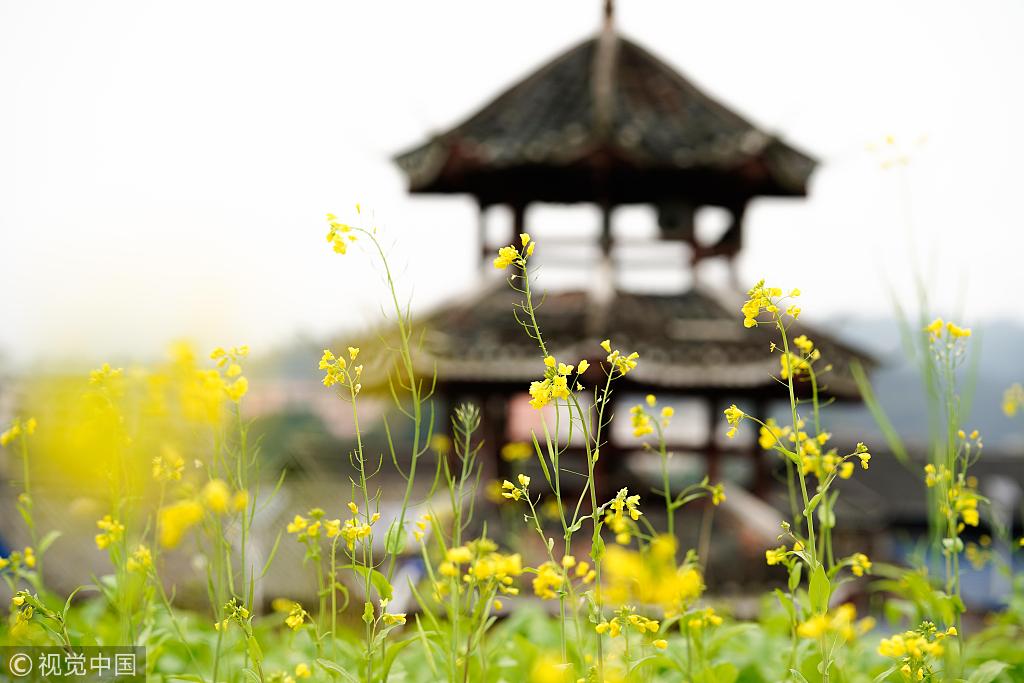 2018年12月15日,贵州黔东南,榕江县寨蒿镇三洲村侗寨外油菜花开,为冬日增添融融暖意。图为油菜花掩映中的侗寨鼓楼。 贺俊怡(贵州分社)/中新社/视觉中国