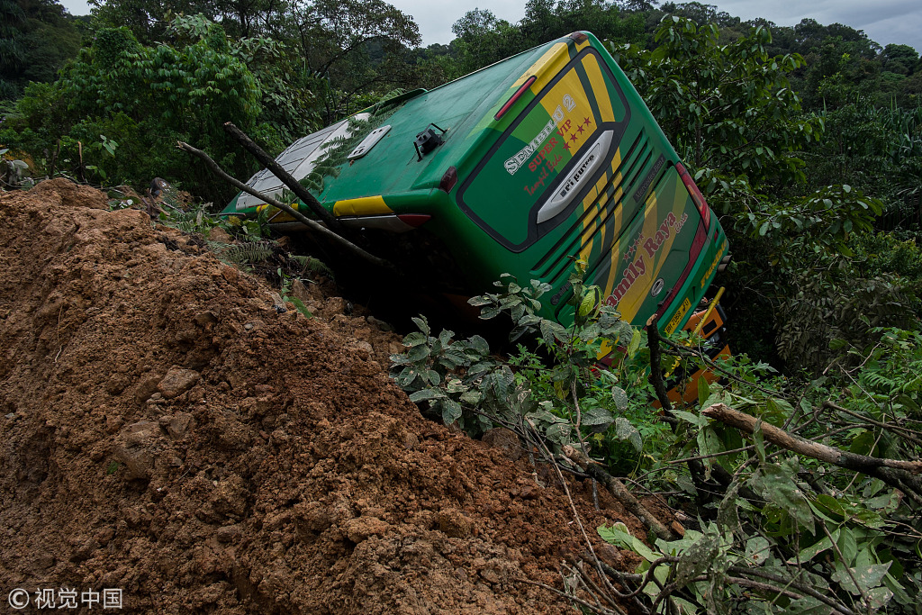 当地时间2018年12月14日,印尼西苏门答腊,暴雨引发滑坡,一辆客车被掩埋。