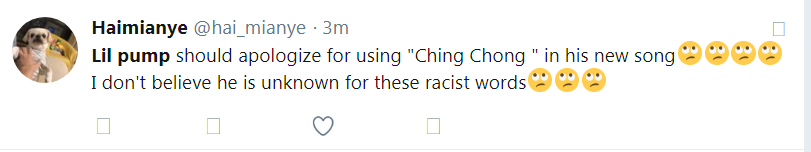 网友Haimianye?:利尔·庞普应该为在新歌中使用“Ching Chong”一词而道歉,我不认为他不知道这些种族歧视的词汇的意思。