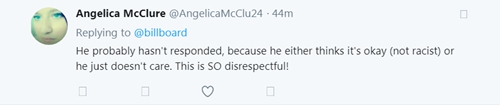 网友Angelica McClure:他可能还没回应,因为他要么觉得这没什么问题(不是种族主义),要么根本就不关心,这太没有礼貌了!