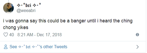 网友@bri:我本来想说这可能是一首震耳欲聋的歌曲,直到我听到Ching Chong这个词。