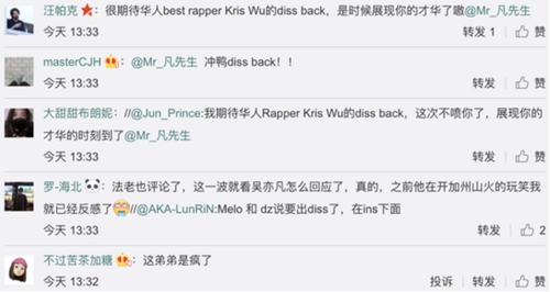 而在中国社交媒体微博上,网友还纷纷@吴亦凡,希望skr skr的他,能够用说唱音乐反击回去。