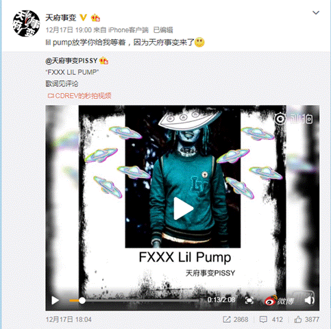 当地时间12月16日,18岁的美国说唱歌手利尔·庞普(Lil Pump)在社交媒体网站Instagram上晒出自己的新歌《蝴蝶门》(Butterfly Doors)。