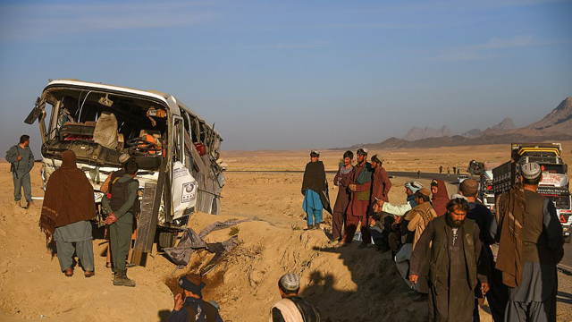 当地时间2018年12月17日,阿富汗坎大哈省,喀布尔-坎大哈高速公路上发生一辆公共汽车与一辆拖车相撞事故,造成3人死亡,32人受伤。