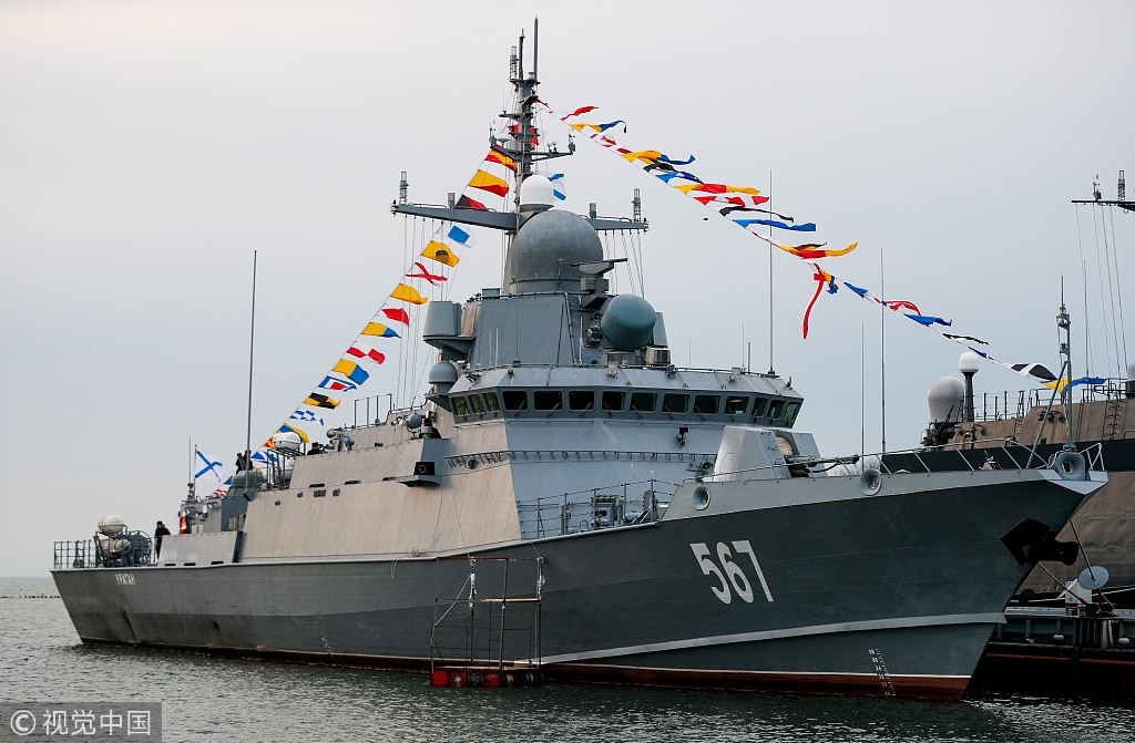 当地时间2018年12月17日,俄罗斯加里宁格勒地区,俄罗斯一艘“梅季希”导弹护卫舰(Mytishchi missile corvette)在波罗的斯克海军基地加入波罗的海舰队。