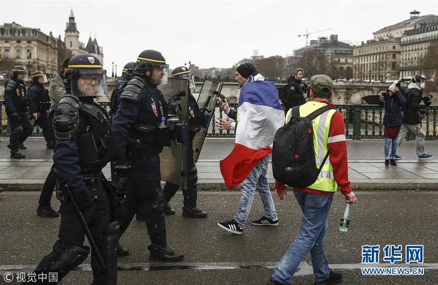 2018年12月22日,法国,“黄背心”示威持续。法国的“黄背心”运动最初是为了抗议计划中的燃料涨价,但后来演变成大规模抗议总统政策和管理方式的示威运动。(图片来源:视觉中国)