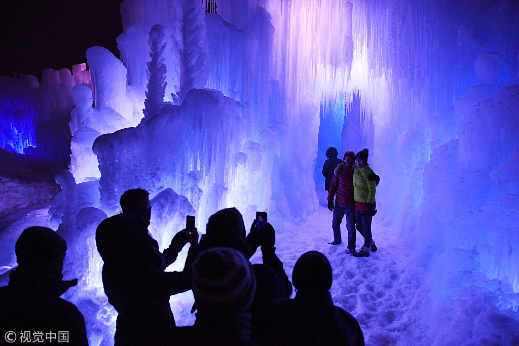 当地时间2018年12月21日,美国科罗拉多州迪伦,人们参观冰雕艺术家们制作的冰雪城堡。这座冰城堡拥有穹顶、滑梯、喷泉、隧道和塔楼,并被色彩绚丽的灯光点亮。