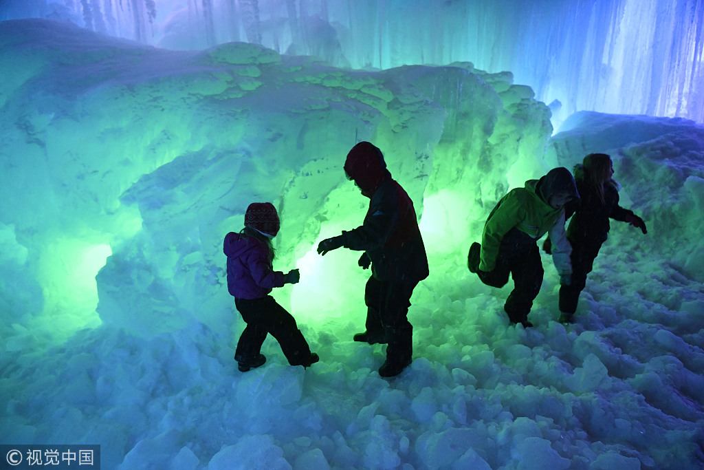 当地时间2018年12月21日,美国科罗拉多州迪伦,人们参观冰雕艺术家们制作的冰雪城堡。这座冰城堡拥有穹顶、滑梯、喷泉、隧道和塔楼,并被色彩绚丽的灯光点亮。