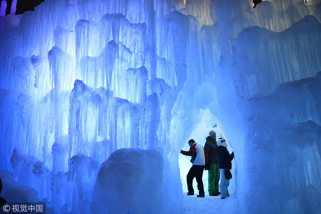 当地时间2018年12月21日,美国科罗拉多州迪伦,人们参观冰雕艺术家们制作的冰雪城堡。这座冰城堡拥有穹顶、滑梯、喷泉、隧道和塔楼,并被色彩绚丽的灯光点亮。