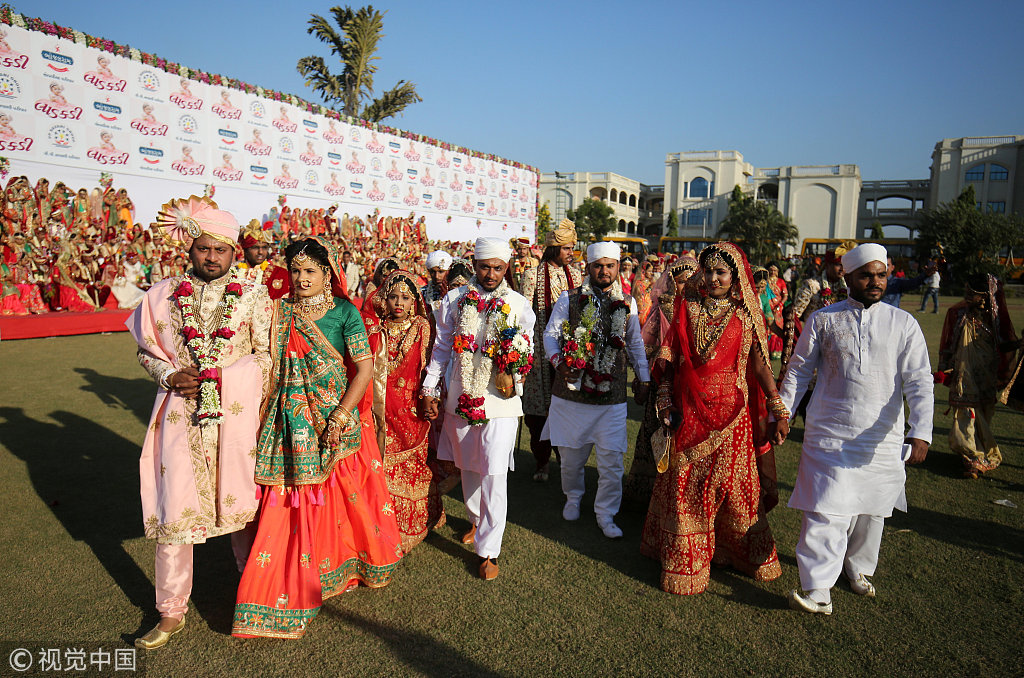 当地时间2018年12月23日,印度古吉拉特邦,一名钻石商人为261对新人举行了盛大的集体婚礼。