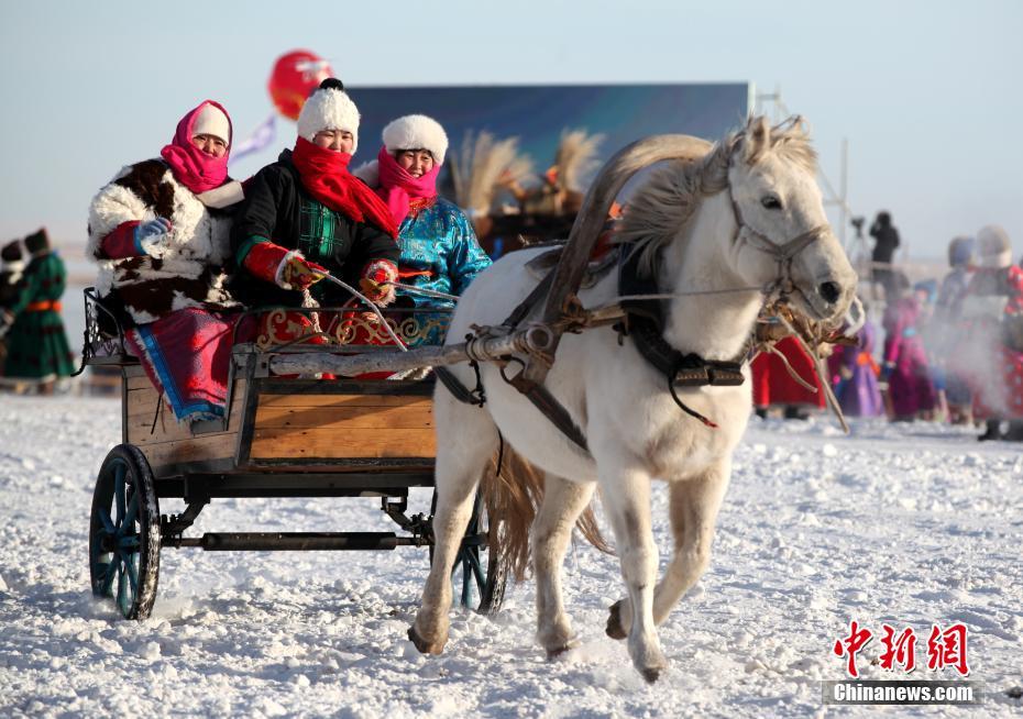蒙古族妇女驾着马车前来参加冰雪那达慕。中新社记者 张玮 摄