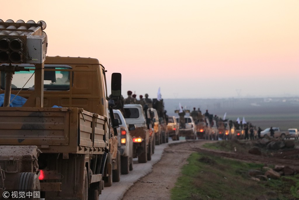 当地时间2018年12月24日,叙利亚Azez,叙反对派武装叙利亚自由军部队的陆战车辆和装甲车开往叙利亚曼比季前线。