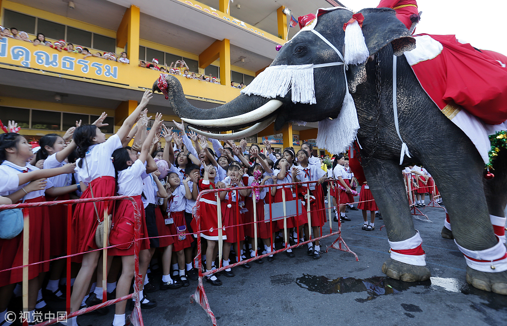 当地时间2018年12月24日,泰国大城府,大象穿着圣诞主题服装,前往学校给孩子们送圣诞礼物,并表演杂技,为学校增添了欢乐的圣诞节气氛。