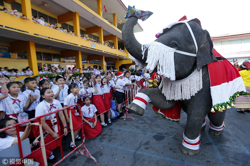 当地时间2018年12月24日,泰国大城府,大象穿着圣诞主题服装,前往学校给孩子们送圣诞礼物,并表演杂技,为学校增添了欢乐的圣诞节气氛。