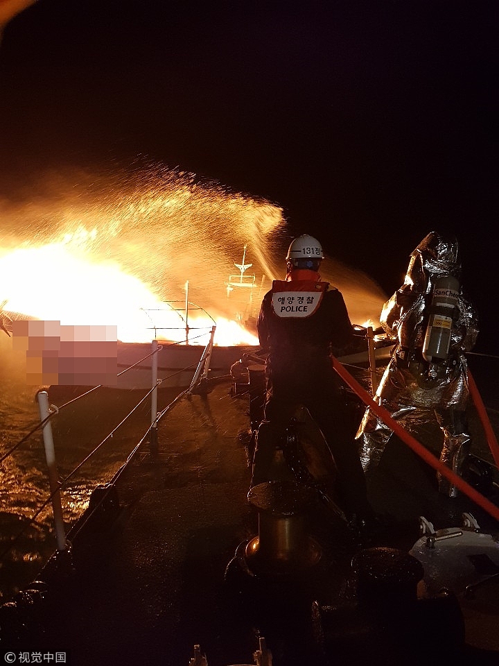 当地时间2018年12月24日,韩国丽水,当地海域一条船舶发生火灾,4名船员被周边渔船救起。海警紧急赶到进行灭火作业。