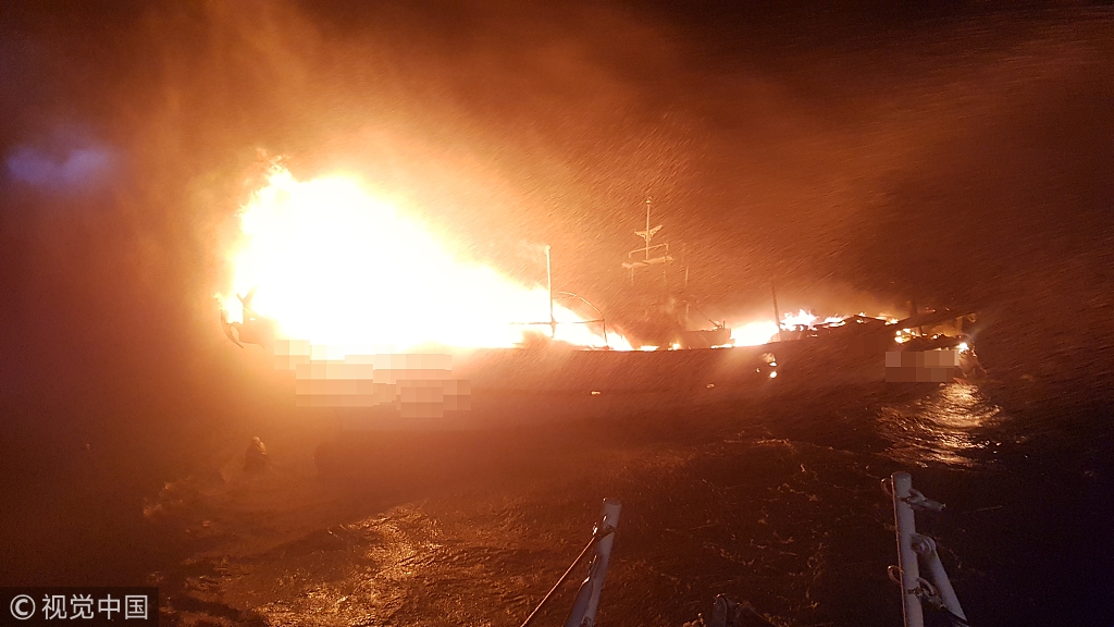 当地时间2018年12月24日,韩国丽水,当地海域一条船舶发生火灾,4名船员被周边渔船救起。海警紧急赶到进行灭火作业。