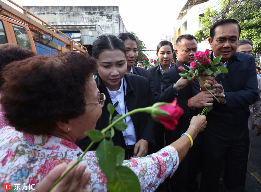 泰国总理巴育走访社区 获“迷妹”献花人气火爆