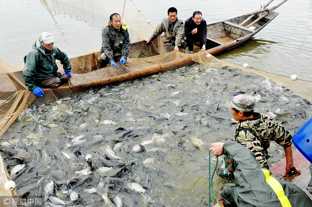 2018年12月23日,江西上饶,万年县石镇镇珏田村养鱼户展示自家今年待销的大草鱼。仅当天,江西省万年县石镇镇珏田村就销售了草鱼、鲢鱼和鲫鱼等4万多斤。据了解,今年初该县石镇镇珏田村通过对外发包的形式,把村里近千亩的鱼塘进行承包制,让有经验,会养殖的专业人员养殖四大家鱼等,从而实现年产家鱼超过千万斤的好收成。不仅壮大了村级集体经济,同时吸纳本村40多户贫困户通过鱼塘养殖走出贫困。