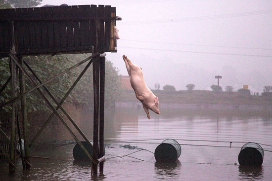 2012年11月22日,湖南省宁乡县金洲镇关山村村民将饲养的土猪赶往高台进行跳水锻炼,以提高猪肉的品质和口感。 视觉中国资料图