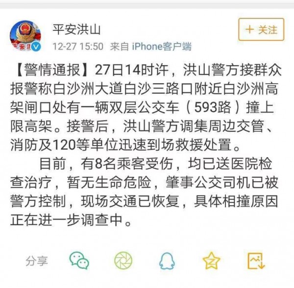 31469203,.武汉公交撞限高杆8名乘客受伤 司机已被控制,.2018-12-27 16:17:26,.204232,.朱箫