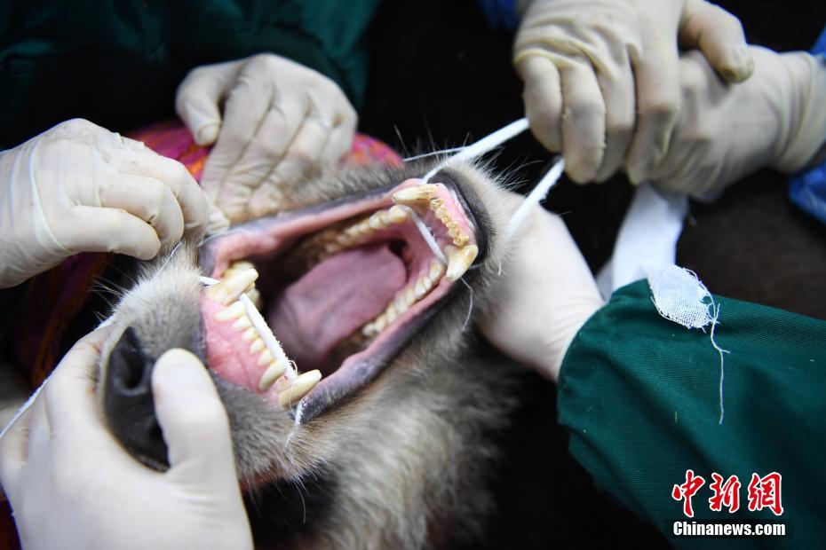 检查大熊猫“小核桃”口腔。 李传有 摄