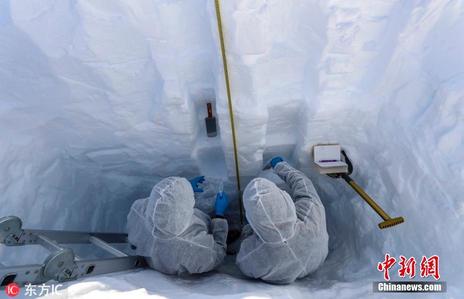 委内瑞拉科研人员Juan Maunel Carrera和他的智利同事Jose Jorquera持续对“南极反射效应“进行研究。冰对来自于太阳的能量的反射率大约是水的5至16倍,而在冬天,冰盖的面积是夏天时的5倍,可想而知南极冰盖的存在和缩胀对全球气候变化的影响。图为委内瑞拉科研人员Juan Maunel Carrera和他的智利同事Jose Jorquera在一个雪坑中采集样本。