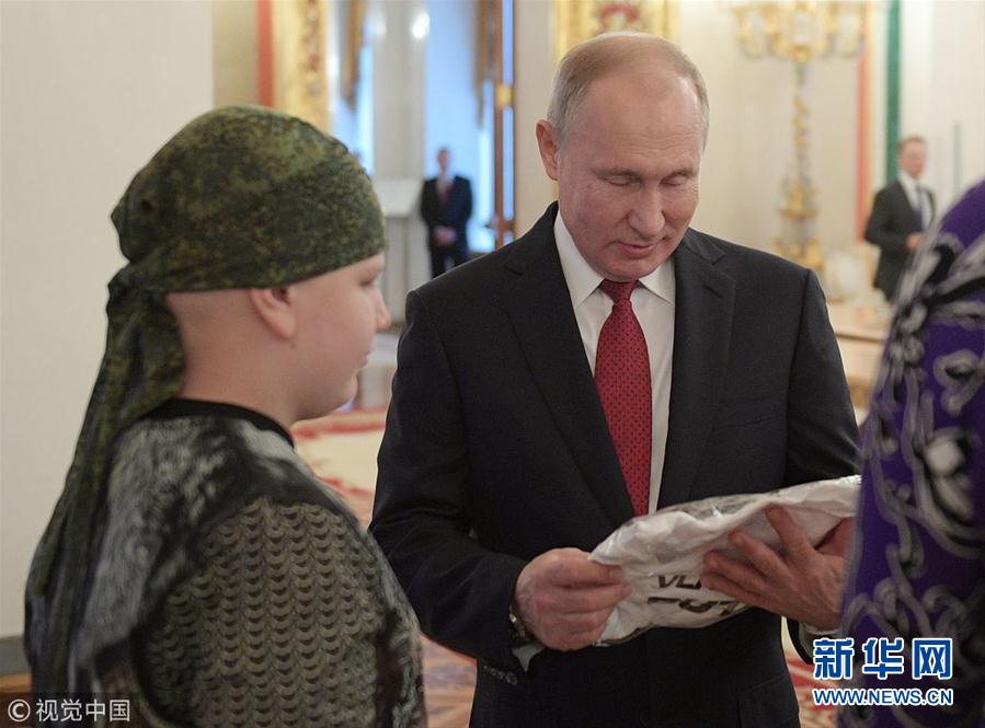 当地时间2018年12月27日,俄罗斯莫斯科,俄罗斯总统普京接见10岁小男孩Kolya Kuznetsov。12月5日,普京出席了俄志愿者国际论坛并参加了满足重病患儿愿望的“梦想与我”慈善项目,承诺帮助该项目中的5名参加者完成梦想,而Kolya Kuznetsov就是其中一名,他的梦想是和普京握手。(图片来源:视觉中国)