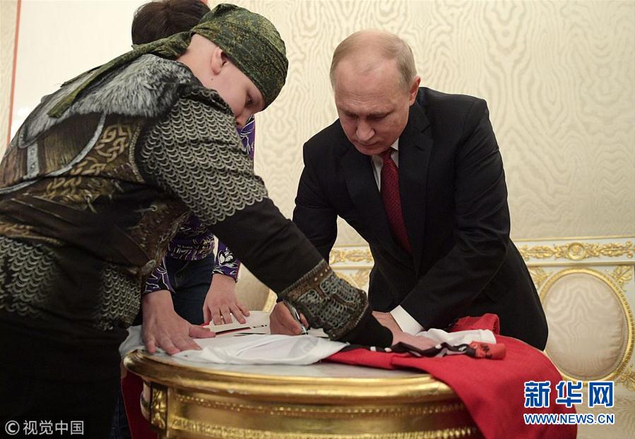 当地时间2018年12月27日,俄罗斯莫斯科,俄罗斯总统普京接见10岁小男孩Kolya Kuznetsov。12月5日,普京出席了俄志愿者国际论坛并参加了满足重病患儿愿望的“梦想与我”慈善项目,承诺帮助该项目中的5名参加者完成梦想,而Kolya Kuznetsov就是其中一名,他的梦想是和普京握手。(图片来源:视觉中国)