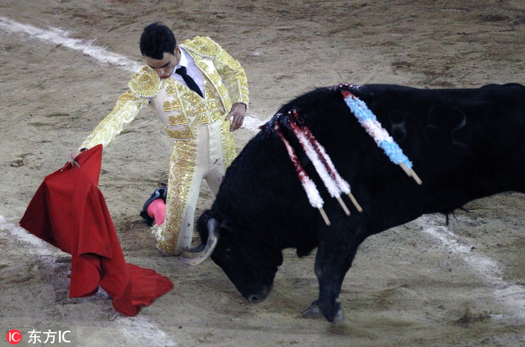 当地时间2018年12月27日,哥伦比亚卡利,当地举行斗牛活动,斗牛士挥舞手中红布,与牛“共舞”。