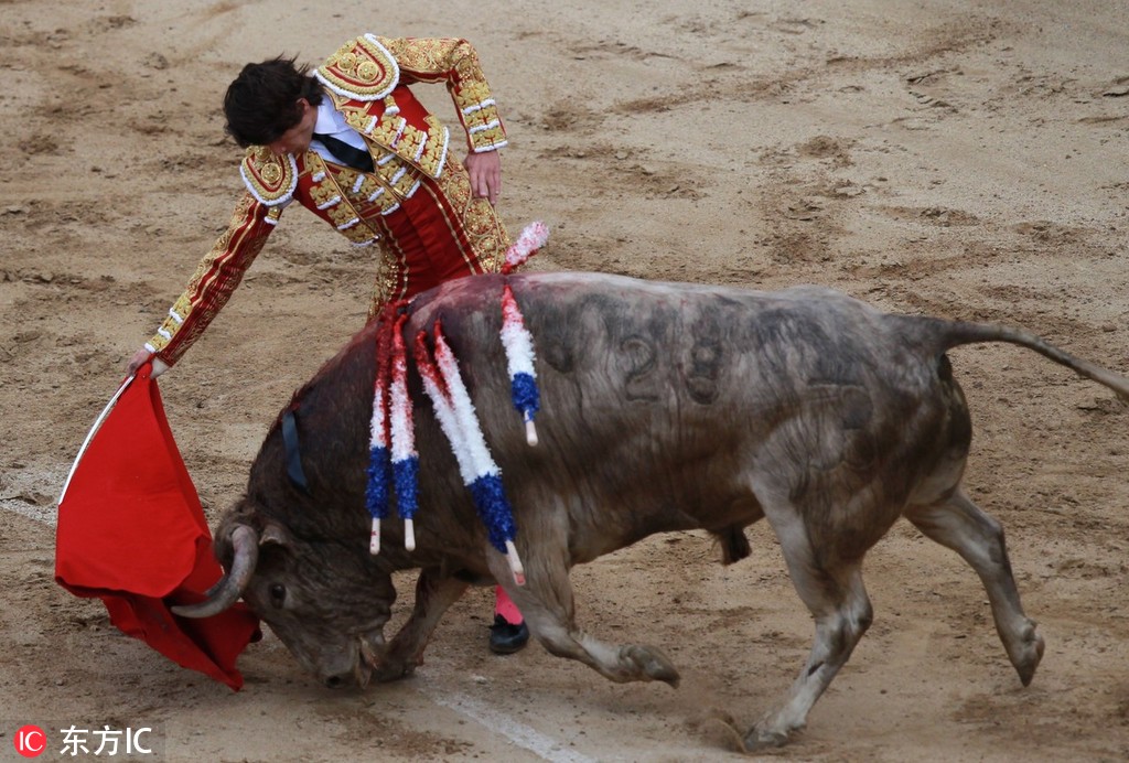 当地时间2018年12月27日,哥伦比亚卡利,当地举行斗牛活动,斗牛士挥舞手中红布,与牛“共舞”。