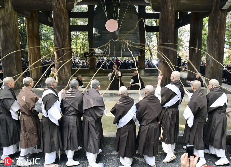 当地时间2018年12月27日,日本京都,知恩院的僧侣彩排新年敲钟仪式。正式的敲钟仪式将在新年除夕夜举行。
