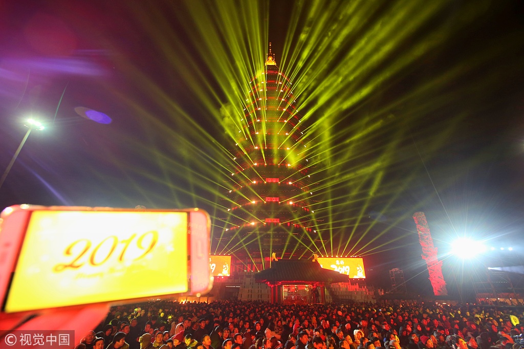 2019年1月1日,江苏常州天宁宝塔新年灯光秀绚丽多彩。