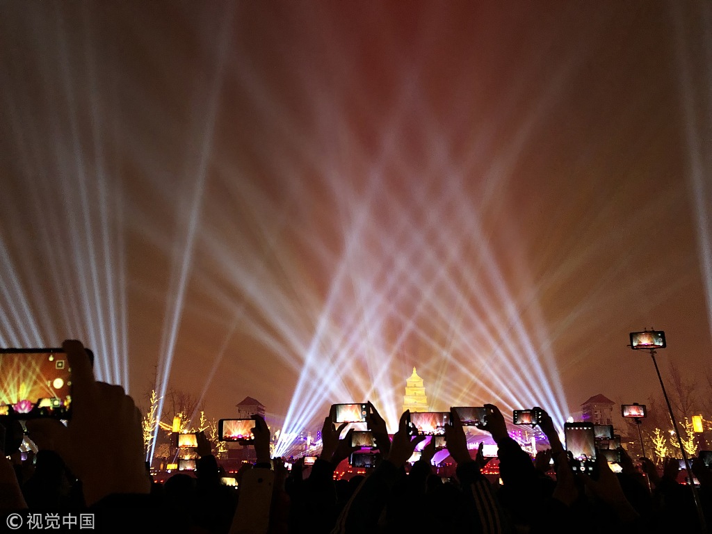 2019年1月1日0:01分,西安大雁塔北广场祈福新年的人们。